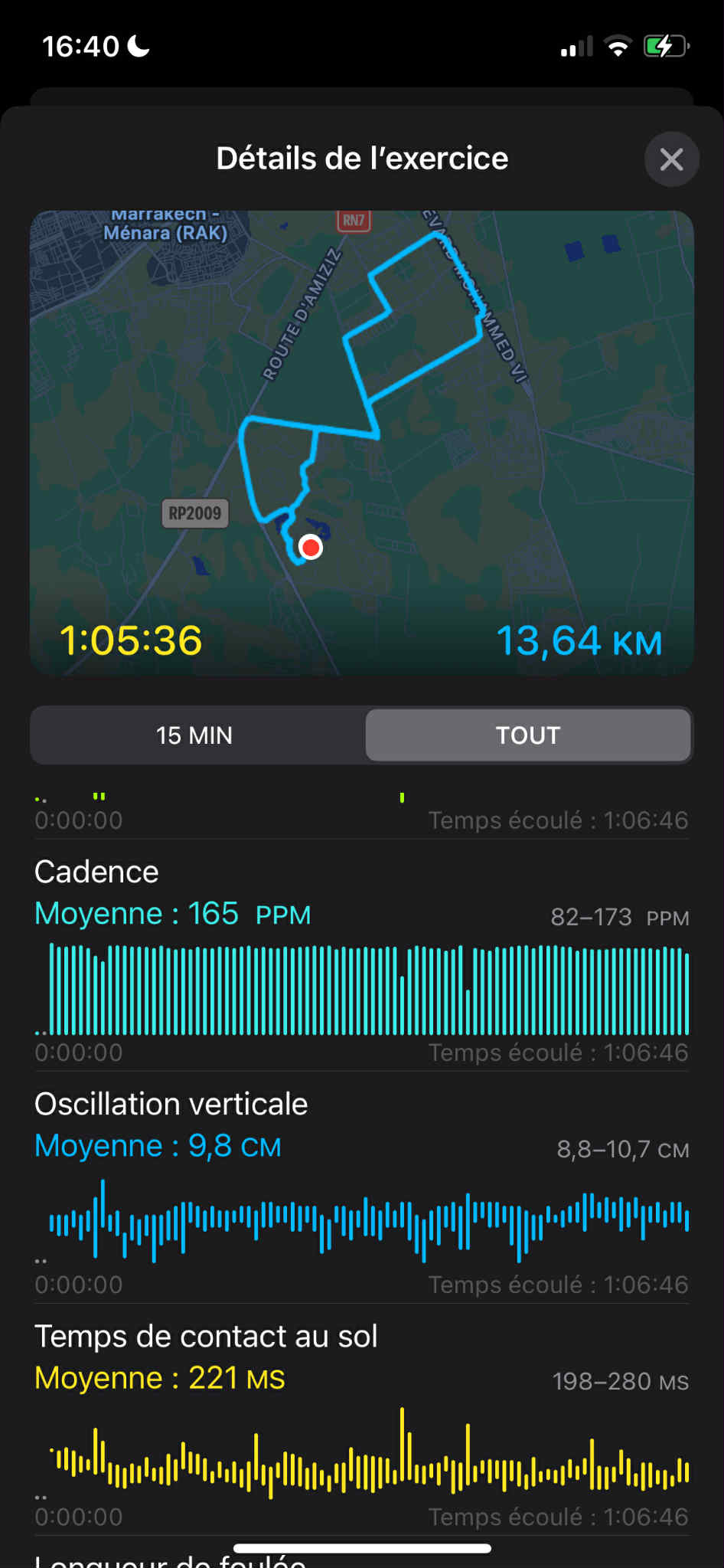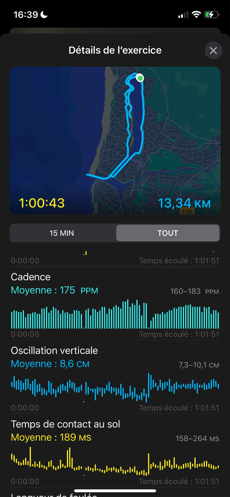 - Temps de contact au sol : je suis passé de 221 ms à 189 ms. Là encore, c’est une excellente nouvelle : je passe moins de temps à “m’écraser” au sol et plus de temps à rebondir. C’est l’effet “ressort” que j’essaie d’installer depuis plusieurs semaines.