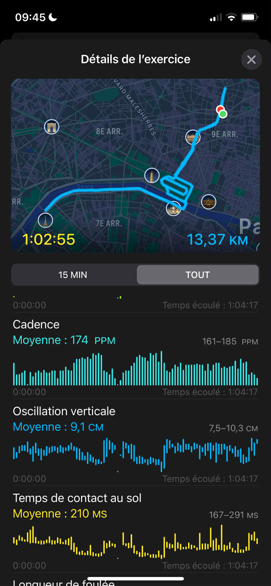 J’ai également un temps de contact au sol de 210ms et une oscillation verticale moyenne de 9,1cm.